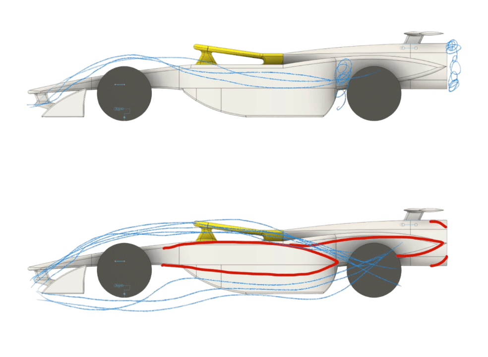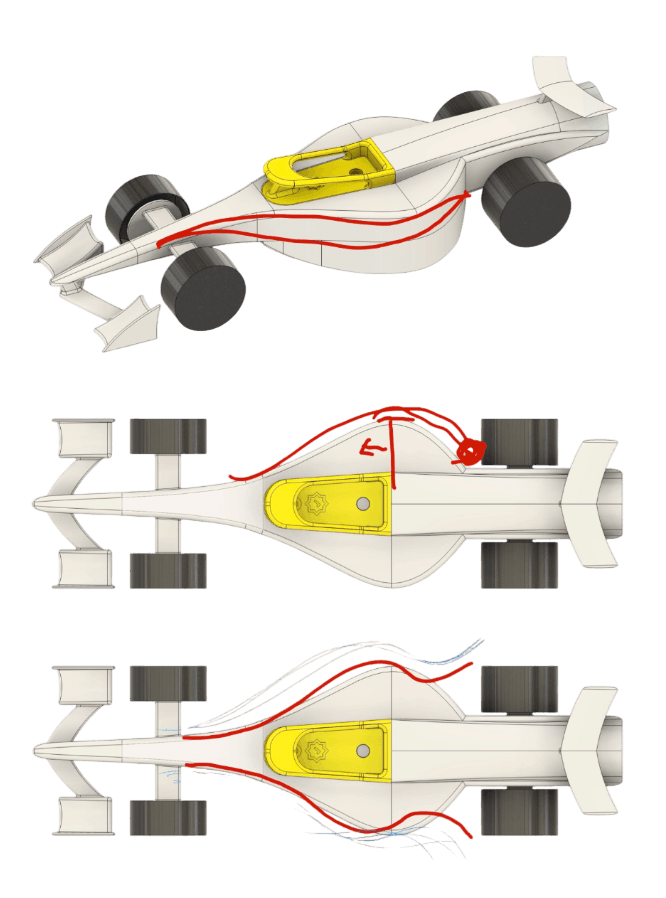 At this stage, we fully shifted focus to aerodynamics. With most areas already minimized by regulation, we explored various sidepod designs to redirect airflow more efficiently around the rear wheels.
